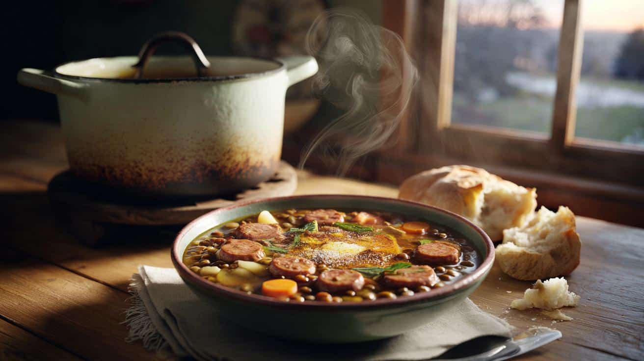 For me, that feeling has a name: a big pot of rustic lentil and sausage stew. Thick, rich, full of carrots, onions, garlic, and little coins of browned sausage, it’s the opposite of fussy. It smells like someone has been taking care of you for hours.